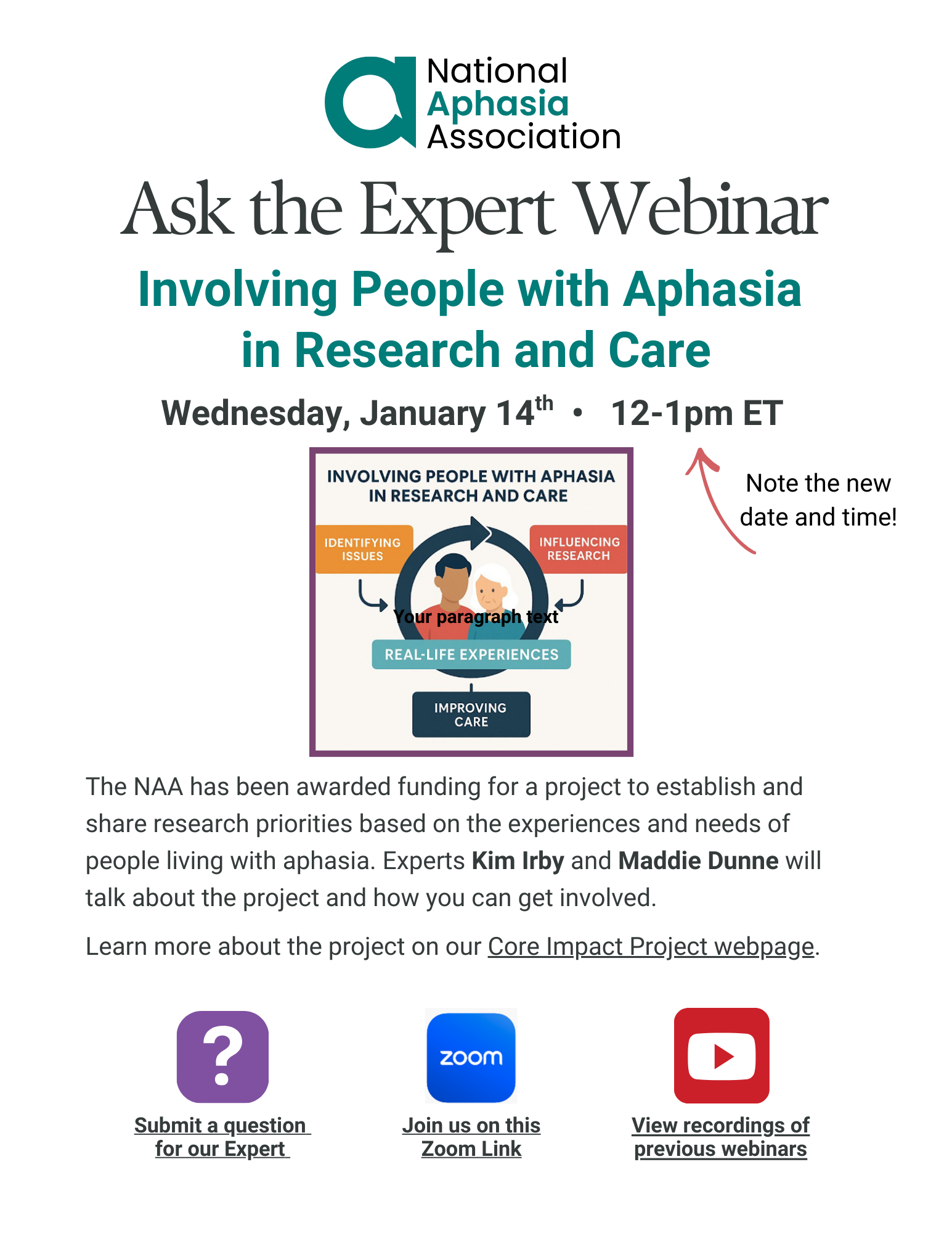 Description: The NAA has been awarded funding for a project to establish and share research priorities based on the experiences and needs of people living with aphasia. This month’s experts Kim Irby and Maddy Dunne will talk about the project and how you can get involved. Learn more about the project on our Core Impact Project webpage.
