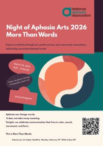 Art, music, writing, movement, video, and digital works all communicate meaning—without relying on spoken language. Night of Aphasia Arts honors these many ways of expressing identity, emotion, and connection.