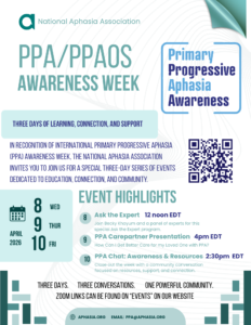 In recognition of International Primary Progressive Aphasia (PPA) Awareness Week, the National Aphasia Association invites you to join us for a special three-day series of events dedicated to education, connection, and community.