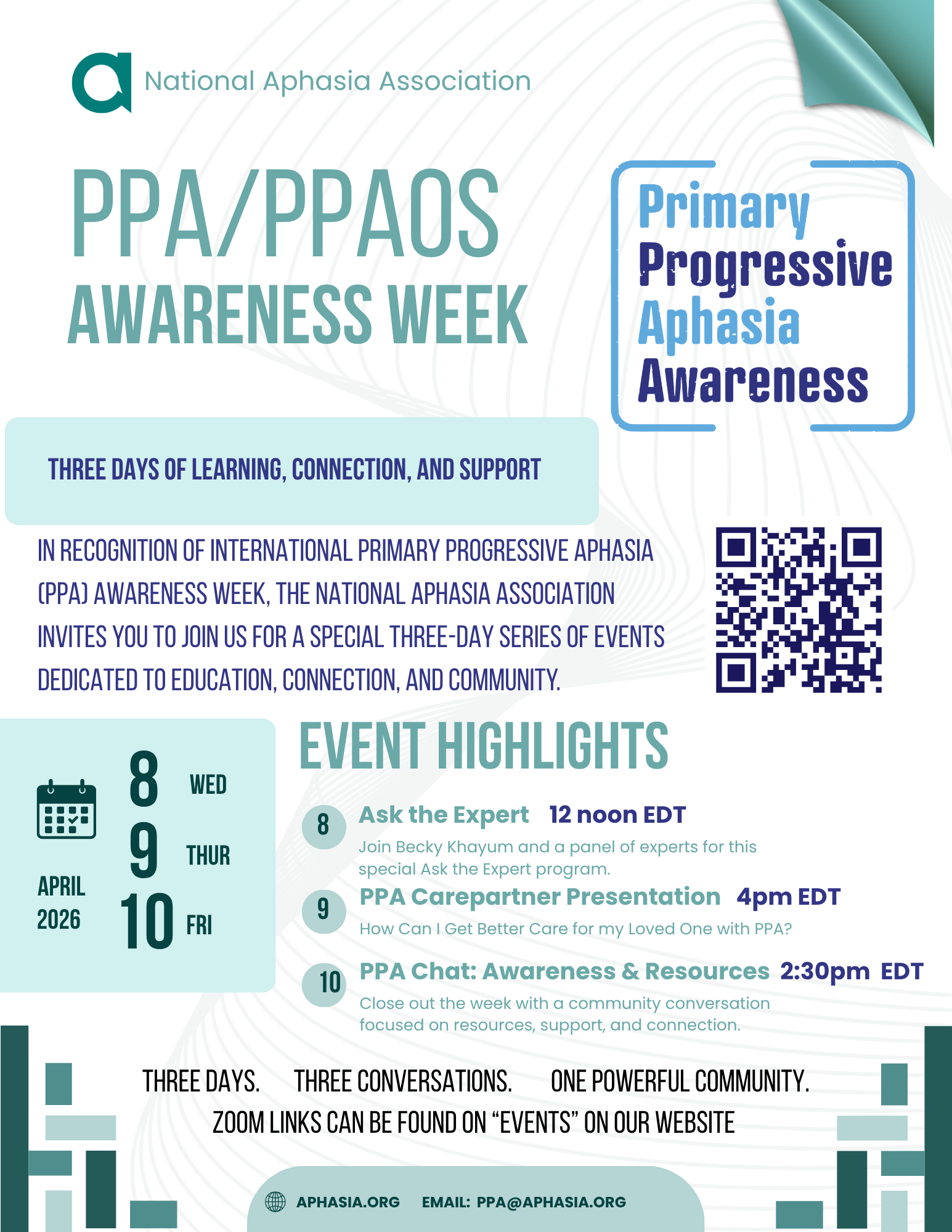 In recognition of International Primary Progressive Aphasia (PPA) Awareness Week, the National Aphasia Association invites you to join us for a special three-day series of events dedicated to education, connection, and community.